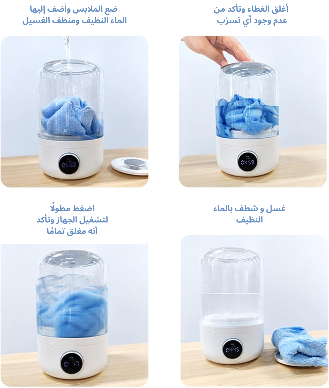 الغسالة سهلة الاستخدام فقط تحتاج ماء عادي متوفر في المنزل أو السفر.
